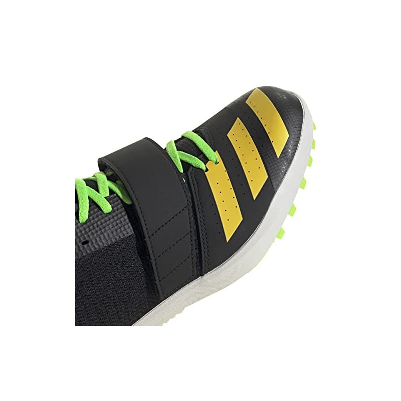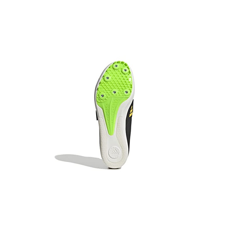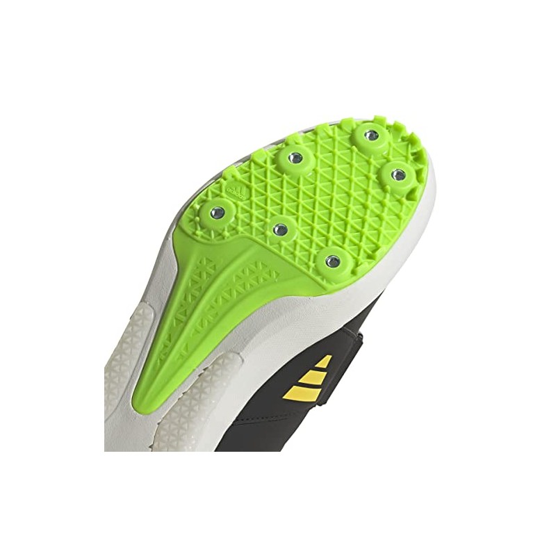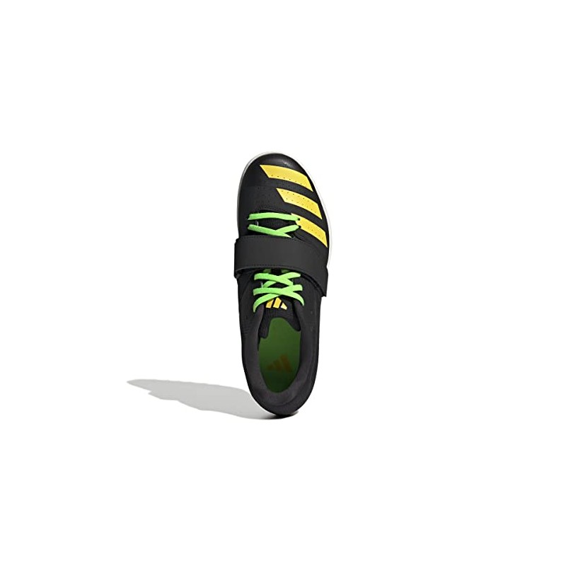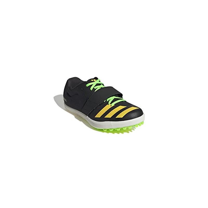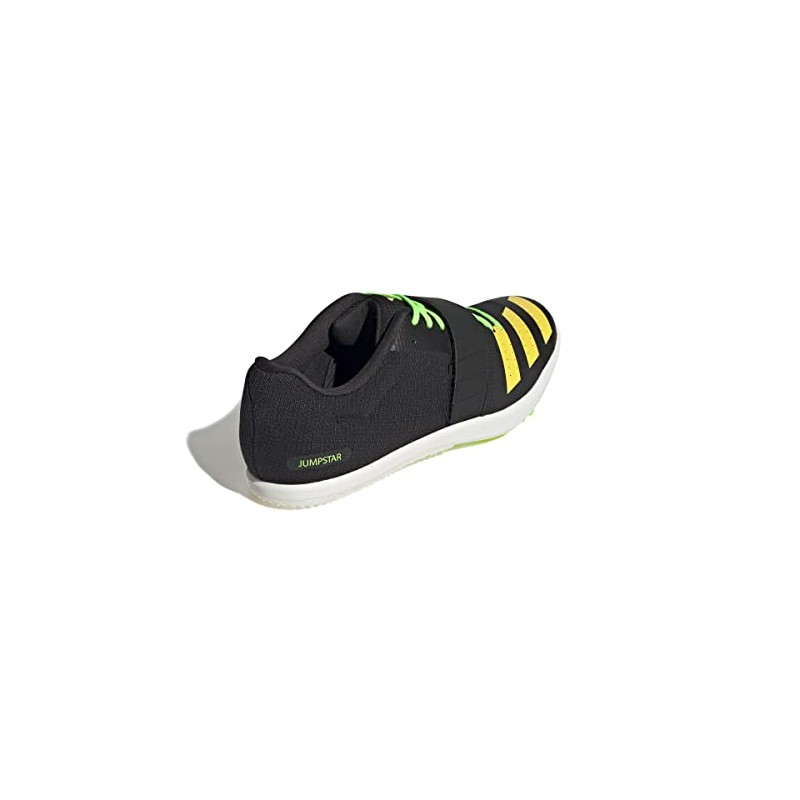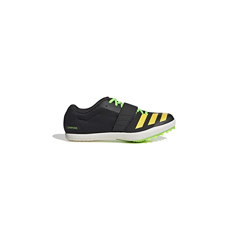 La Zapatilla de Clavos ADIDAS JUMPSTAR, identificada con la referencia exacta GY8415, es un calzado técnico de atletismo diseñado específicamente para pruebas de saltos (salto de longitud, triple salto y salto con pértiga). Este modelo se presenta en una base NEGRA (NEGBÁS), contrastada con detalles vivos en AMARILLO (AMAHAZ) y VERDE LIMA (VERSOL), un esquema de color de alta visibilidad en la pista.